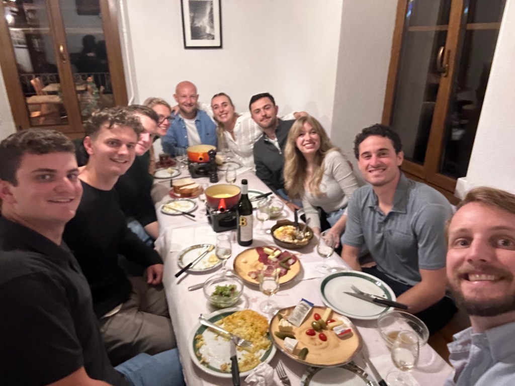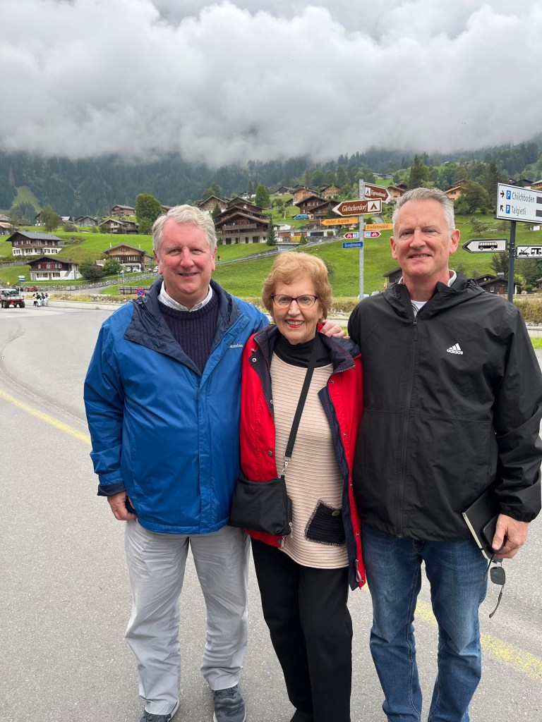 - My nephew’s wedding itself was a postcard brought to life with Malcolm and Elodie’s vows at a Lavaux winery and Vevey hotel patio reception overlooking Lake Geneva, and a five-hour dinner that felt short. Having the entire clan together, no absentees (as we had for niece Claire’s wedding in 2022), was huge. Even our final full day, driving to Lauterbrunnen and taking the small gauge rail up into fog-shrouded mountains, delivered. While the spectacular views were obscured, the day with Mom, Woody and Christi and our mountainside lunch and rail rides all were memorable (see above pic of Woody, Mom and me)
