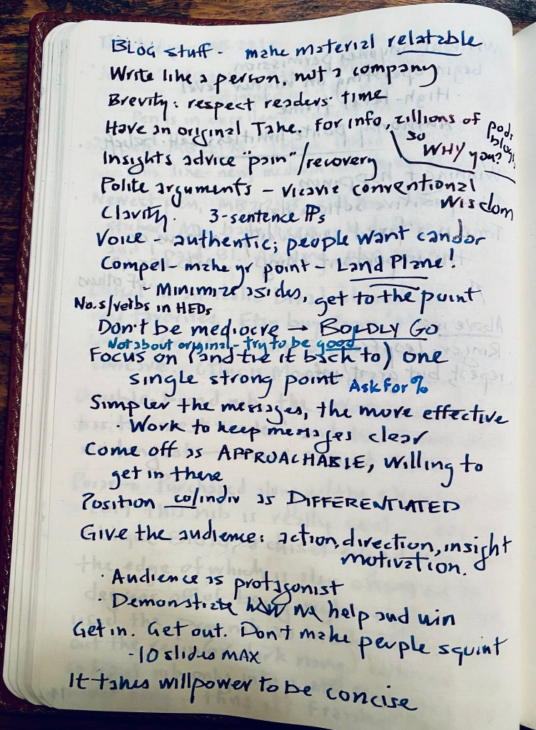 A buddy who died in early 2025 used to hammer this notion. Like a photographer, he’d say, you can get a completely different picture by altering your vantage point. So make sure you do that in writing as well.